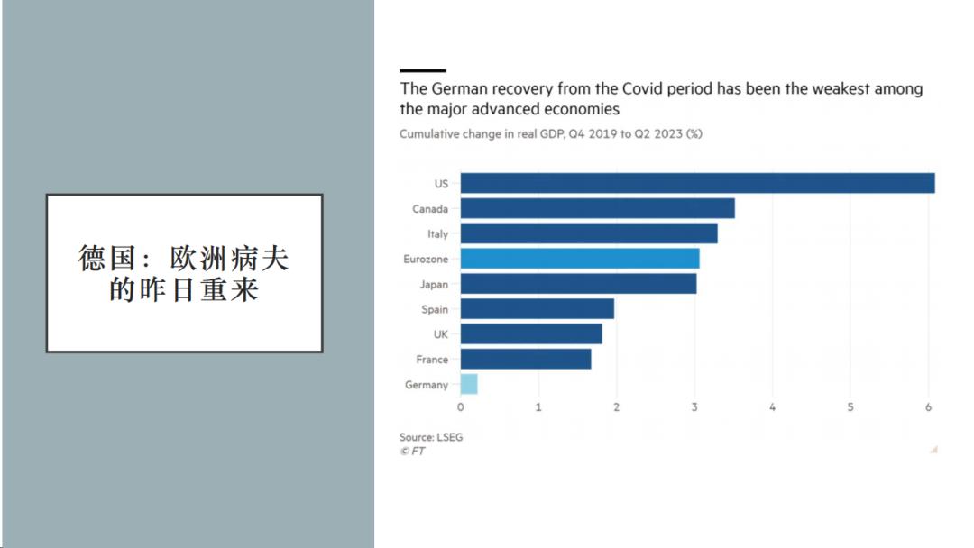 其中最值得一提的是,欧洲经济现在出现了一个非常有趣的变化。我们过去一直认为欧洲经济的主要的动力来源是德国,但是现在欧洲经济的分化开始出现了。欧洲经济的整体它未必很差,我们看见2019年的四季度到2023年的二季度,欧洲主要经济体的国民生产总值的累积变化,欧元区差不多有3%的增长。但是表现最糟糕的是德国。