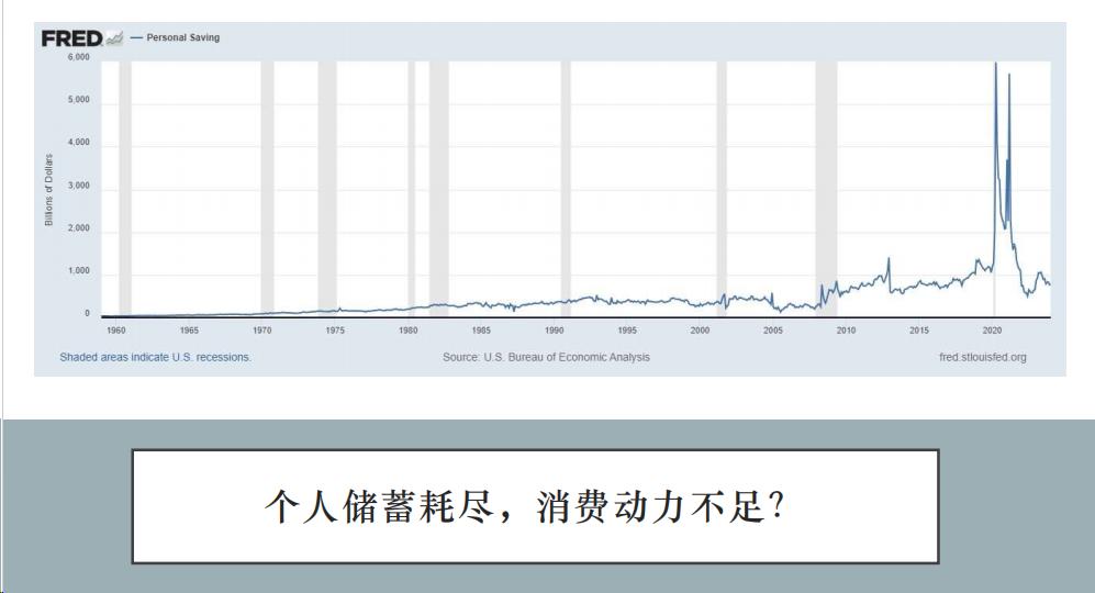 很长时间里很多人对美国的状态不够乐观,主要的原因是没有料到,为什么消费会这么强?疫情的时候发了很多的钱,大家手上有钱所以拿去花;但到了疫情之后,刺激政策退出,这个时候就没有钱消费了。储蓄已经耗尽了,是不是消费动力就没有了?