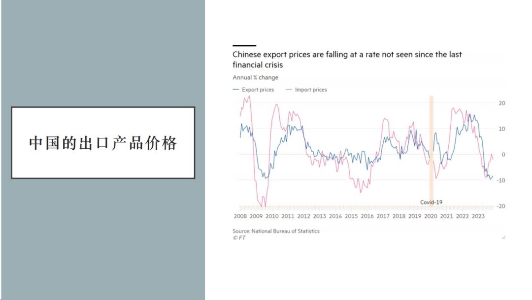 带来的结果就是我们刚才看见的,通缩问题一定会出现。国内的需求是有限的,另一方面国内的供给是在不断增长的,工业产能是在不断扩张的,这两者之间的差距如果不断扩大的话,也就是说国内你卖不出去怎么办,一定是出口对不对?所以中国的出口价格,在图中这条蓝线上,一定是降价在海外进行销售。