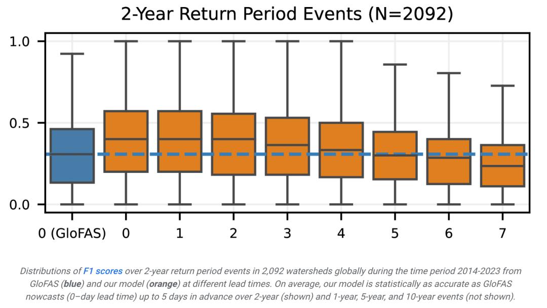 此外,该模型在预测重现窗口(return window)期为五年的极端天气事件时,其准确性与 GloFAS 预测重现窗口期为一年的事件时的准确性相当或更高。