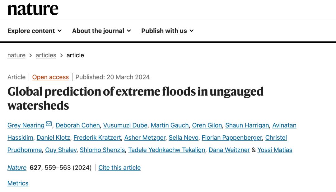 相关研究论文以“Global prediction of extreme floods in ungauged watersheds”为题,已发表在权威科学期刊 Nature 上。