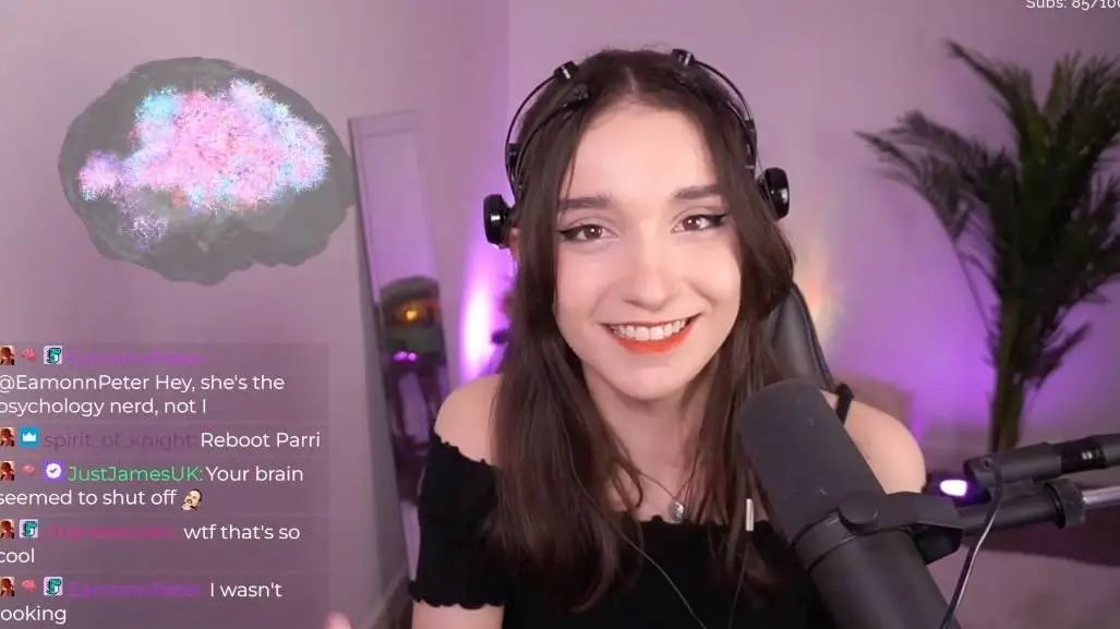 最开始,她戴着 EPOC X 玩恐怖游戏,同时展示自己脑电波的活动,让观众看着她在游戏里遇到吓人的情节时大脑里的灰质区域闪闪亮起(也是一种脑科学科普吧)。