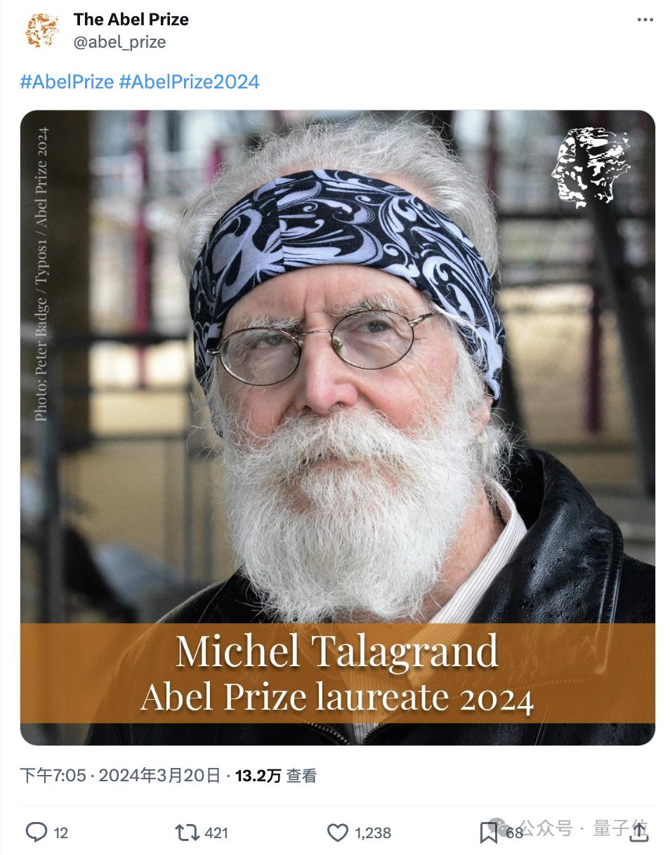 有着“数学诺贝尔奖”之称、与菲尔兹奖齐名的阿贝尔奖,今年颁给了72岁法国数学家米歇尔•塔拉 格兰(Michel Talagrand)——