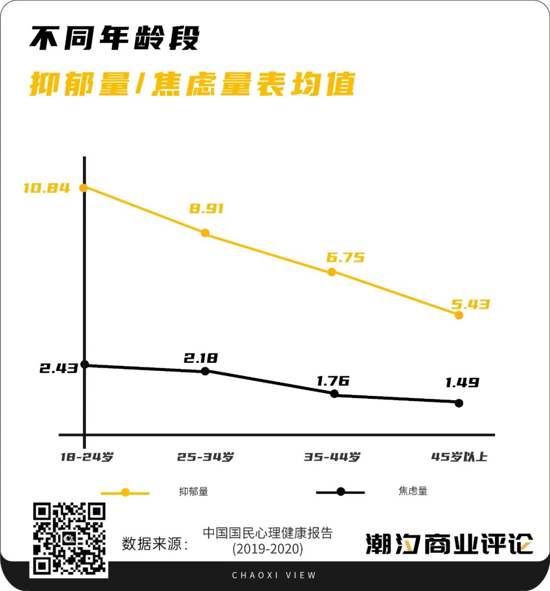 随着社会发展节奏的不断加快,时代的复杂性加剧了他们对未来的不确定,迷茫和焦虑成为了时代的关键词。北京知萌咨询机构发布的《中国消费趋势报告》对3000名18-59岁互联网用户进行了一项调查,结果显示,有76.2%的消费者会感觉到焦虑,来自工作、家庭责任、金钱、经济形势和家人健康的压力成为焦虑的五大主要来源。《中国国民心理健康发展报告(2019-2020)》显示,18岁至34岁的青年焦虑平均水平高于成人期的其他年龄段。