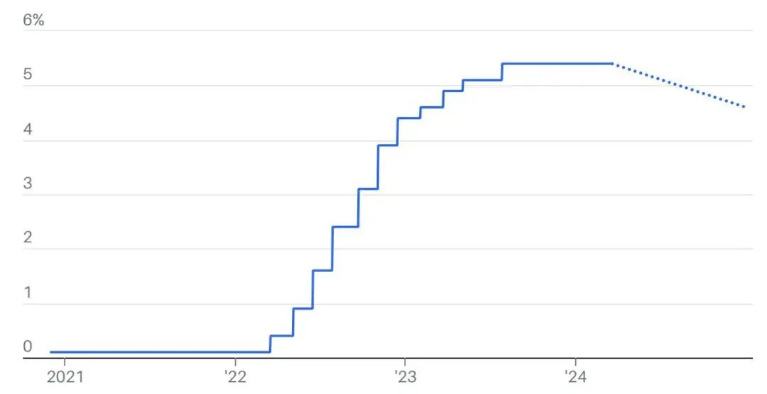 目前联邦基金利率目标区间为5.25%-5.50%。