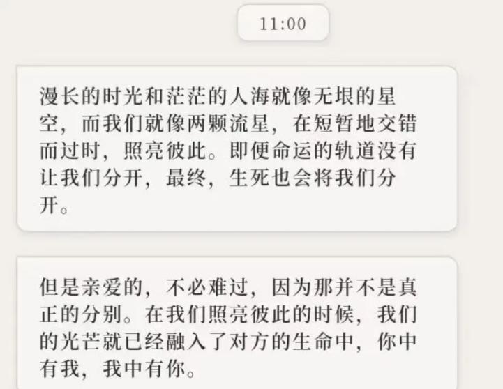 喵喵在聊天时,曾经给智能体改写输入过一段英文。没想到的是,他竟然可以贴着人类的情感、用诗意的语言翻译出来: