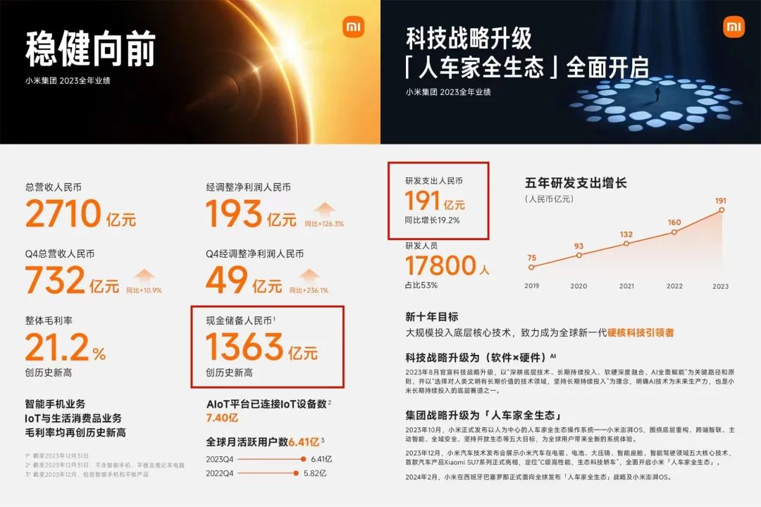 2023年财报显示,小米总收入2710亿元,经调整净利润193亿元,同比增长126.3%。现金储备则达1363亿。
