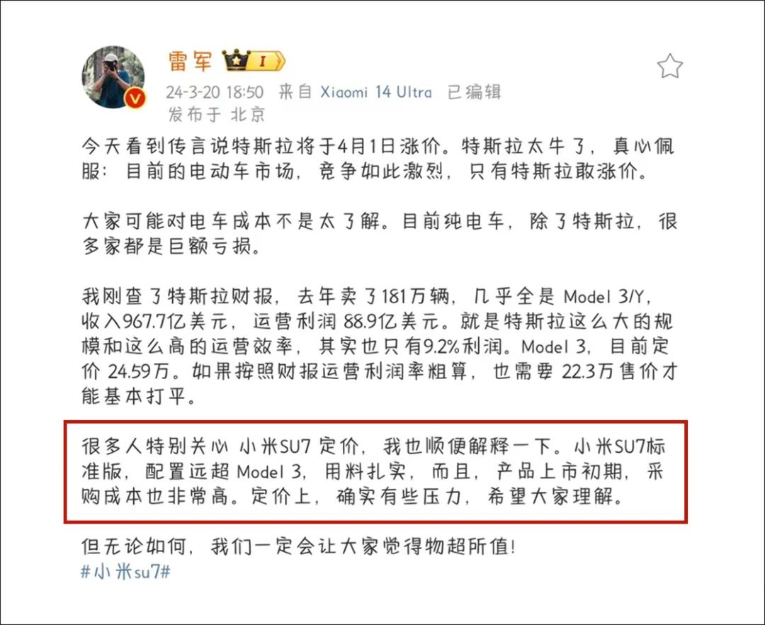 “小米SU7标准版配置远超 Model 3,而且产品上市初期,采购成本非常高。定价上,确实有些压力,希望大家理解。”
