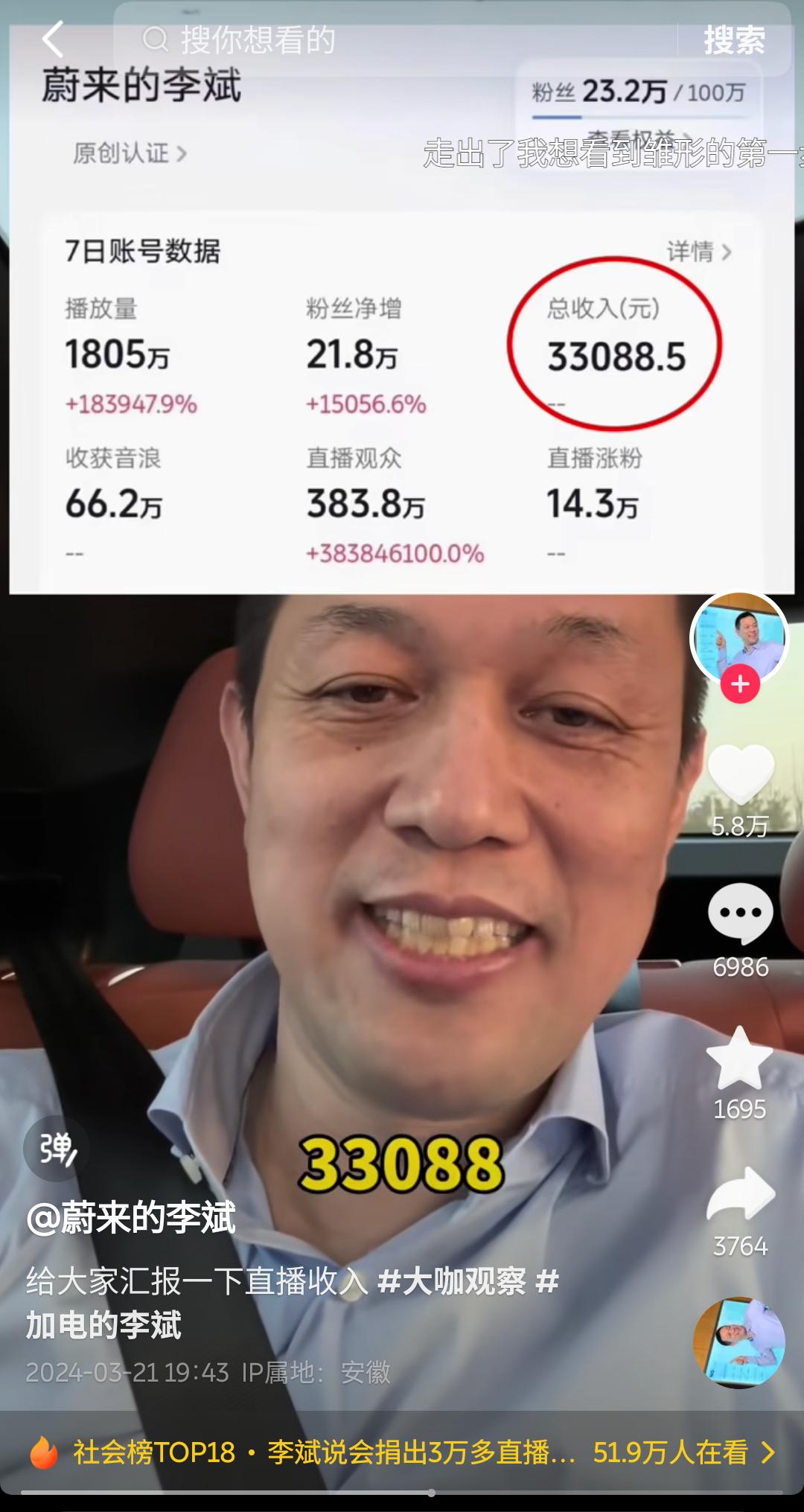 7天进账超3.3万元,蔚来李斌公布直播收入 网友:比卖车还挣钱?
