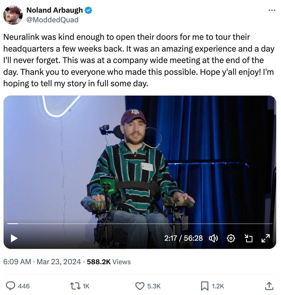 Noland 近期参观了 Neuralink 总部,并在参观结束时的一场公司内部会议上与大家见面,进行了近一小时的访谈对话。今天他在 X 上公开了这段演讲视频。
