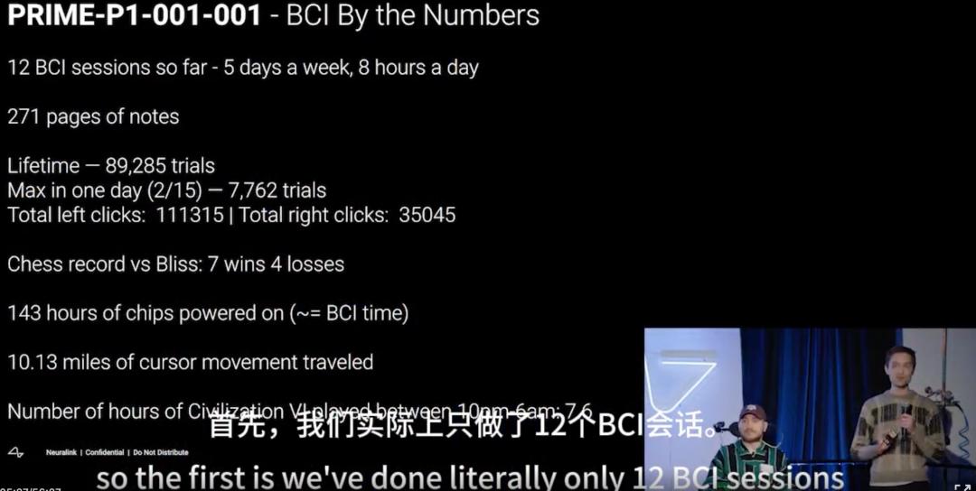 Neuralink 还在这次见面会上透露了一些试验信息,包括他们做了 12 个脑机接口(BCI)会话,Noland 借助 BCI 设备象棋对弈 7 胜 4 负、一天玩 7.6 小时《文明 6》等等。