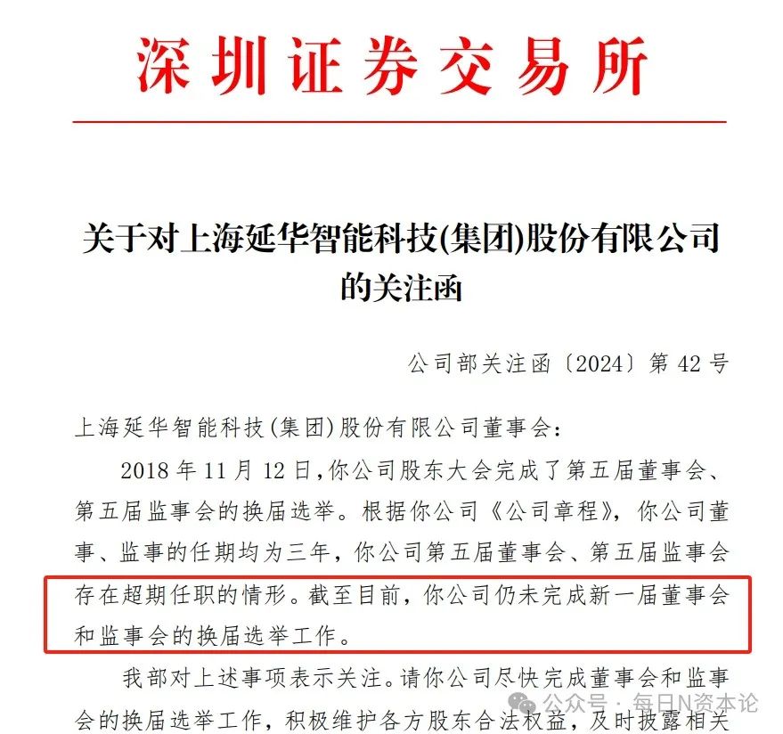根据《公司章程》,董事、监事的任期均为三年,但截至目前,公司仍未完成新一届董事会和监事会的换届选举工作,“超期服役”两年多。深交所要求,延华智能尽快完成董事会和监事会的换届选举工作,并及时披露相关工作进展。
