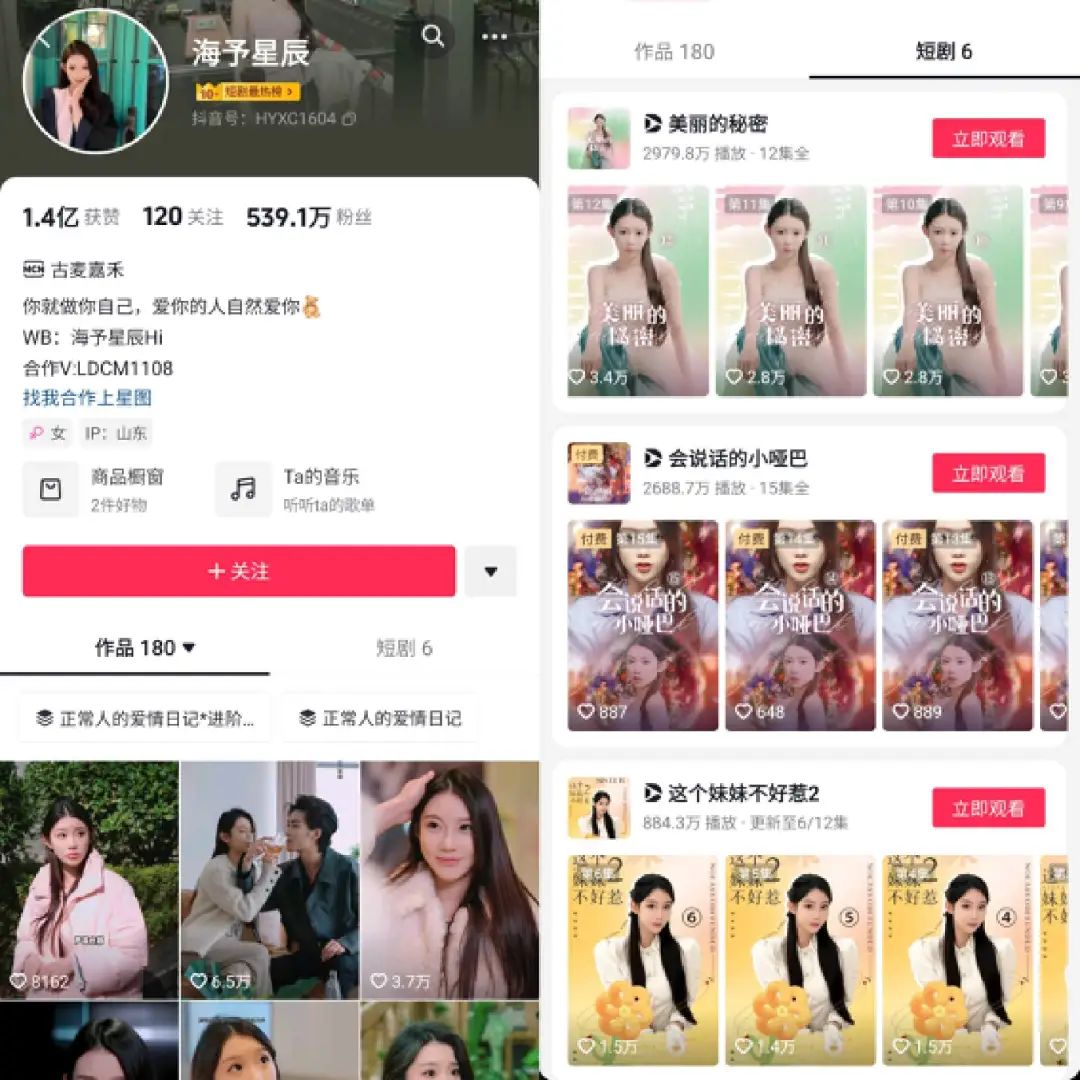 “海予星辰”曾凭借恋爱剧情内容完成了账号从0到1的积累,并在两年前完成了从剧情号达人向短剧达人的转型,拍摄了《我的黑白骑士》等多部短剧。