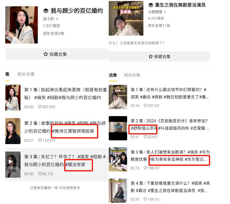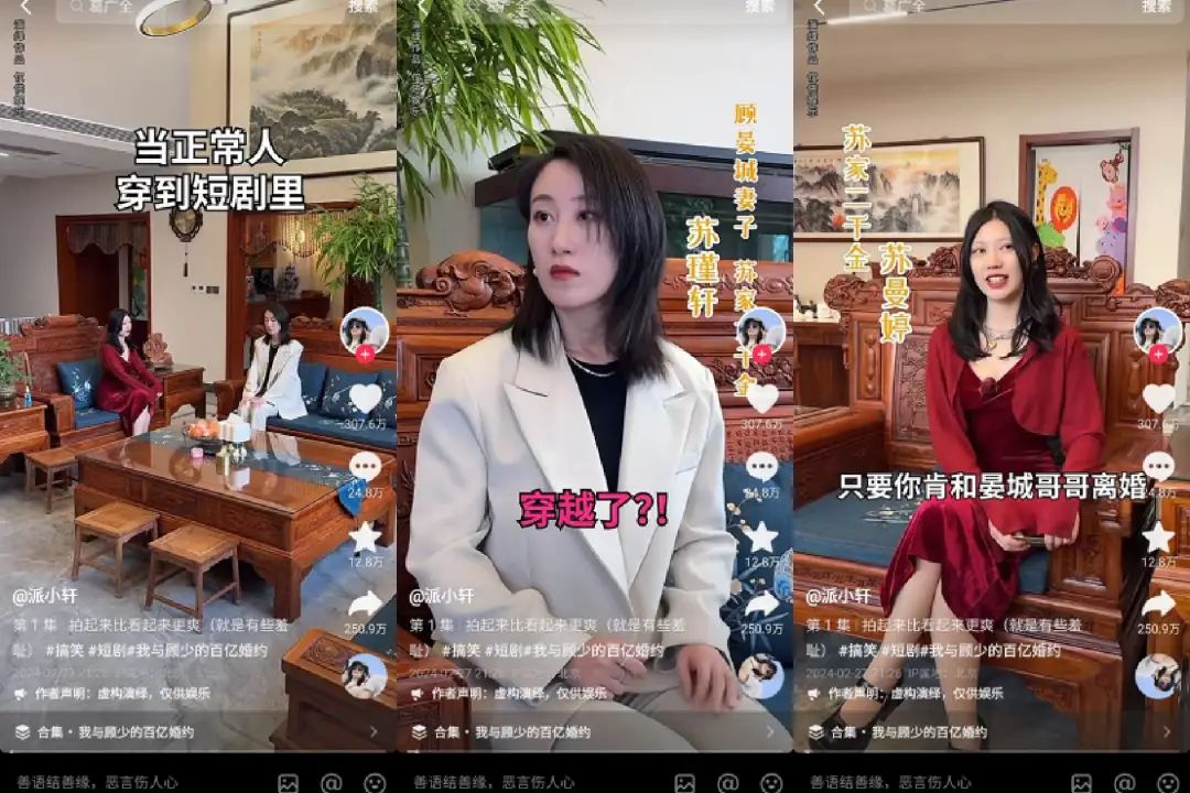 这条视频不仅获赞超300万,也拉开了《我与顾少的百亿婚约》系列的序幕,“派小轩”不断穿越为剧中女主角,上演了一出出短剧“剧中剧”。