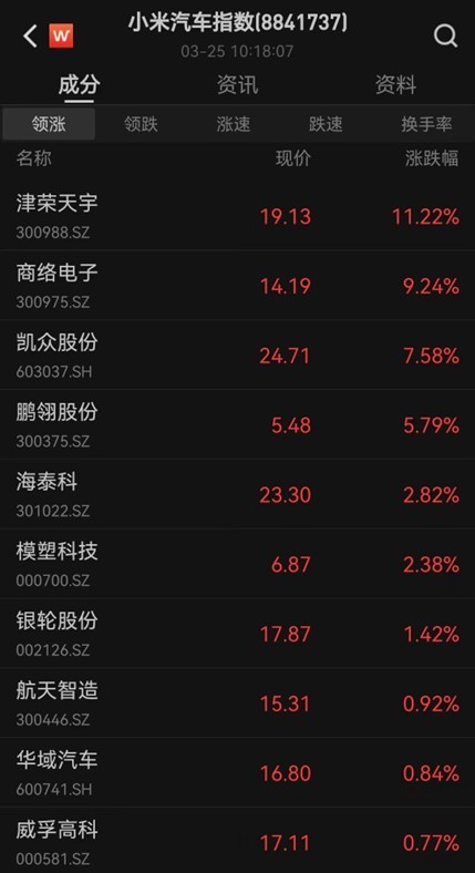 小米汽车概念股早盘活跃,津荣天宇涨超10%,中捷精工、凯众股份、鹏翎股份涨超5%,海泰科、模塑科技等跟涨。消息上,小米汽车SU7将于3月28日晚7点发布。