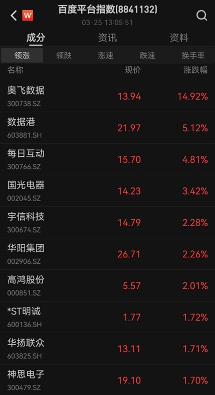 百度概念股午后拉升,奥飞数据涨超16%,依米康涨超12%,润建股份回封涨停,每日互动、证通电子等拉升。