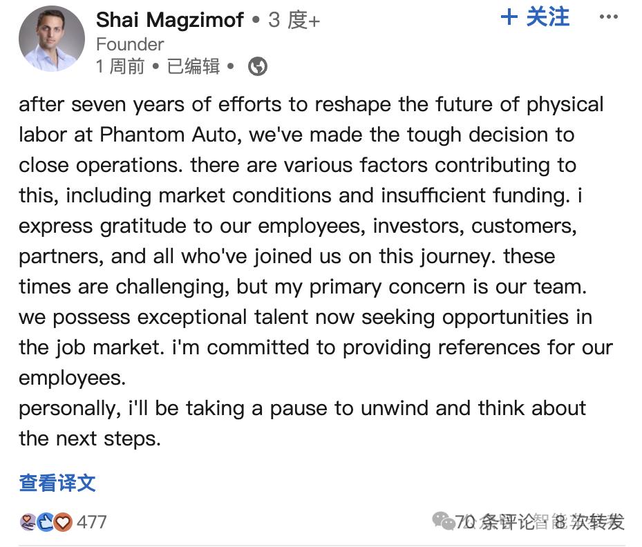 最新消息,专做云代驾的自动驾驶初创公司Phantom Auto,官宣停止运营。