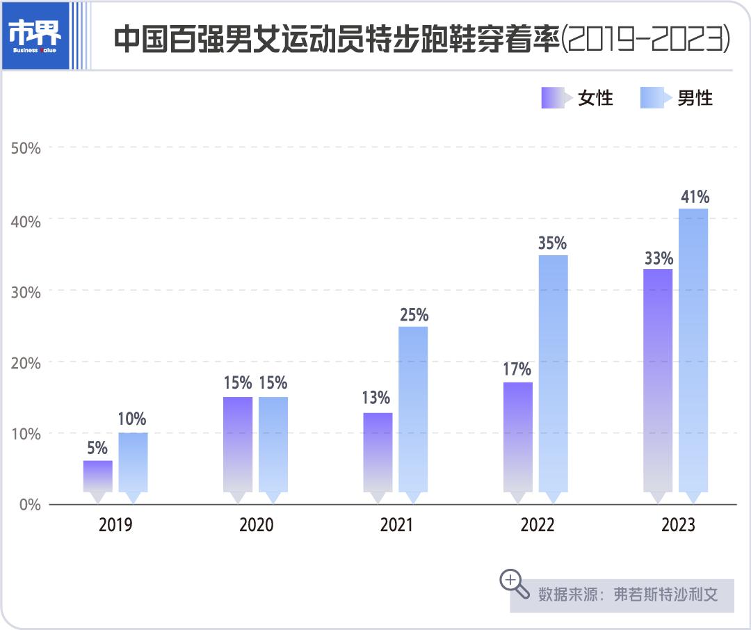 天风证券在一份研报中透露,2023年,特步在中国马拉松男子及女子百强的穿着率创近五年来新高,并连续两年位列所有品牌第一。就连丁水波也自豪地表示,“我们于跑步领域的行业领先地位,推动集团的业务增长,在中国内地多个马拉松赛事中,穿着率超越国际和国产品牌。”