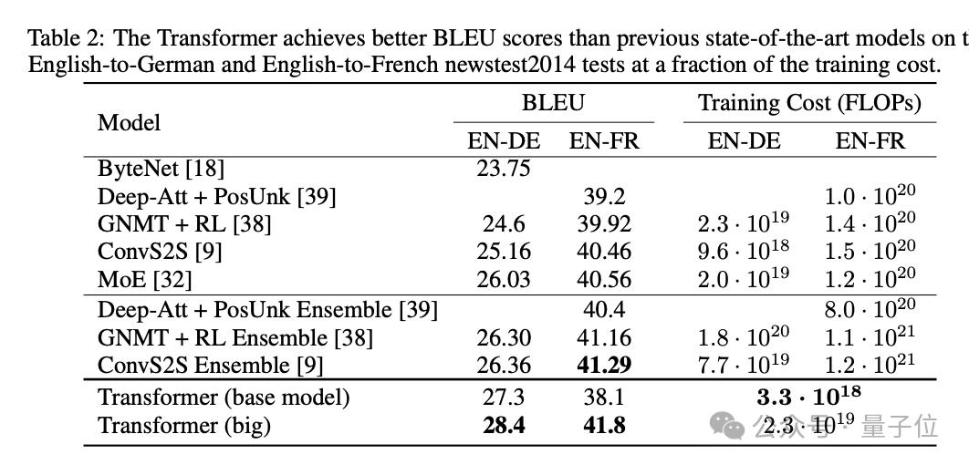 他们训练了基础和大杯两个模型,其中65M基础版就击败了所有同级竞争对手,213M大杯版甚至破了BLEU测试的记录,同时计算效率也更高。