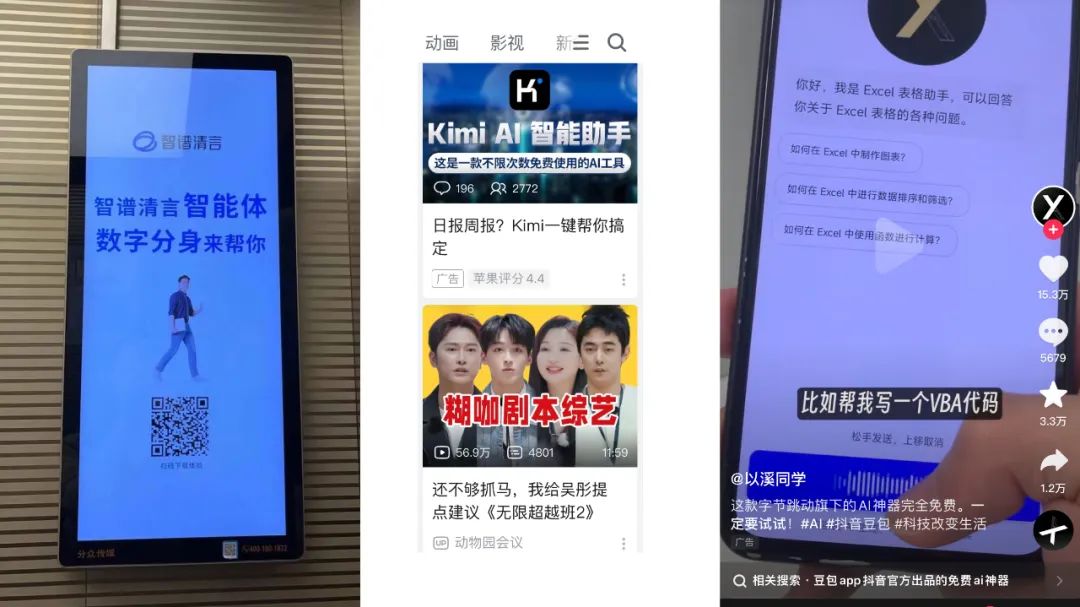 去年,各家已经相继亮剑,智谱、百川、面壁不同程度上都开启了商业化。月之暗面稍慢,目前还未公布商业化的方案,但急切地开始了商业化加速进程,B站、抖音等社交平台都能看到Kimi助手投流的广告。