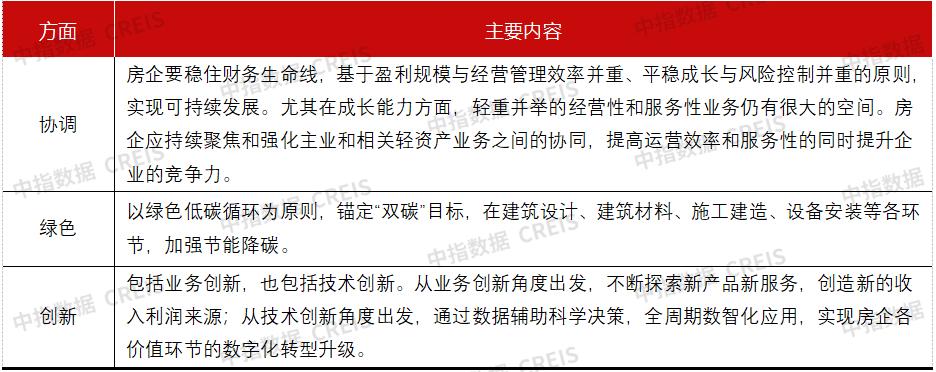 另一方面,则是转变价值创造方式。参考成熟经济体头部企业的转型发展路径,新发展模式本质上是企业价值创造方式的转变。房企应从过去以重资产开发建造为主的单一价值创造,转向以开发、运营、服务多元化的价值创造过程,主要从目标模式、业务模式、盈利模式进行转变。具体来看,一是业务模式从“高负债、高杠杆、高周转”以开发业务为主向轻重并举的开发、运营、服务一体化转型;二是盈利模式从增量开发盈利向增加开发、存量更新、保障性住房建设等综合盈利模式转型;三是目标模式从追求规模快速扩张向品牌品质提升转型。