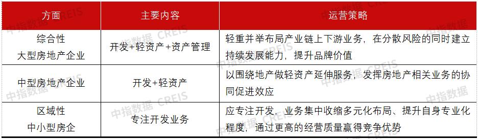 综合来看,区域性中小企业应专注开发业务,通过打造产品力为客户提供差异化服务,提升品牌力从而提升企业的整体竞争力。具有一定的区域竞争力,且以地产为中心辐射部分细分领域展开多元业务的企业可积极探索轻重并举战略,开发业务通过部分转型轻资产代建业务实现降低负债抵抗行业风险,提高利润水平;多元业务则加码“运营+服务”业务,通过多种业态叠加实现产业协同。