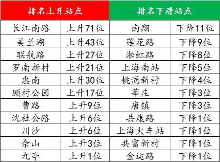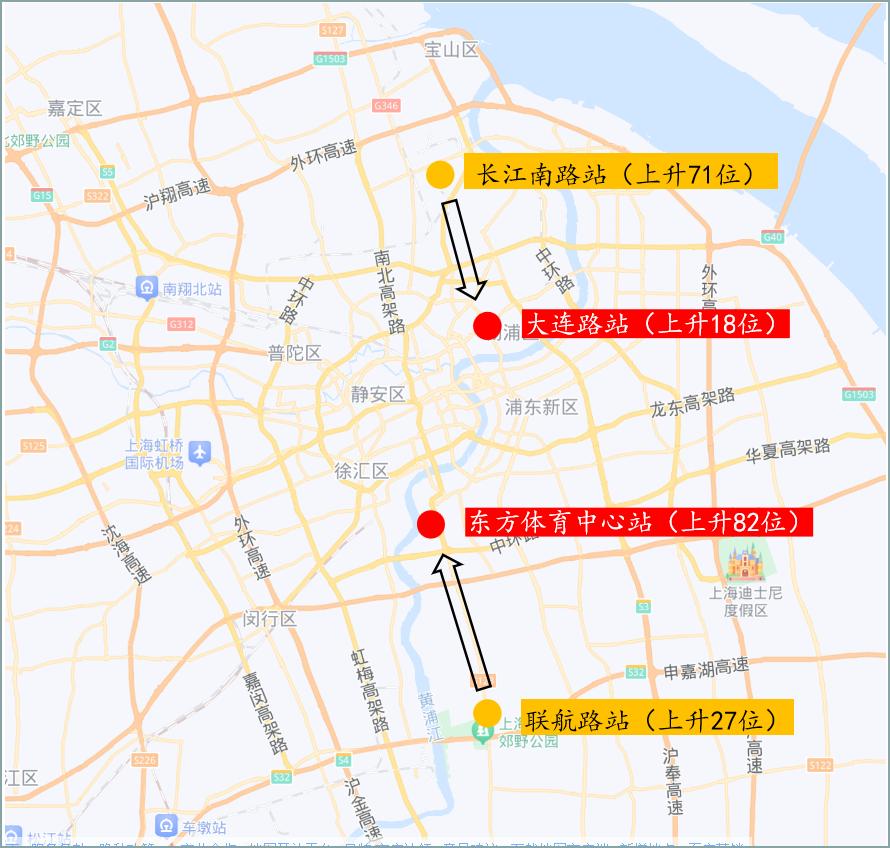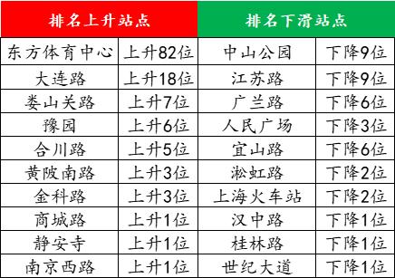 在人广流量下滑的同时,东方体育中心上升了82位、大连路上升了18位。