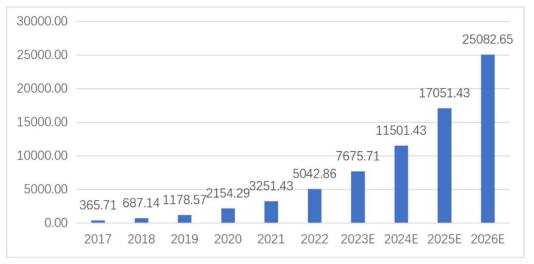 2023年,中国实物网上零售额为13万亿,占社零总额的比例约为28%,较2022年提升1个百分点,拉长时间周期来看,网上社零占比仍处于不断提升的大趋势中。商务部发布的《即时零售行业发展报告》也显示,我国即时零售市场规模从2017年的365.71 亿元增长到2022年的5042.86亿元,预计到2026年将达到25082.65 亿元。