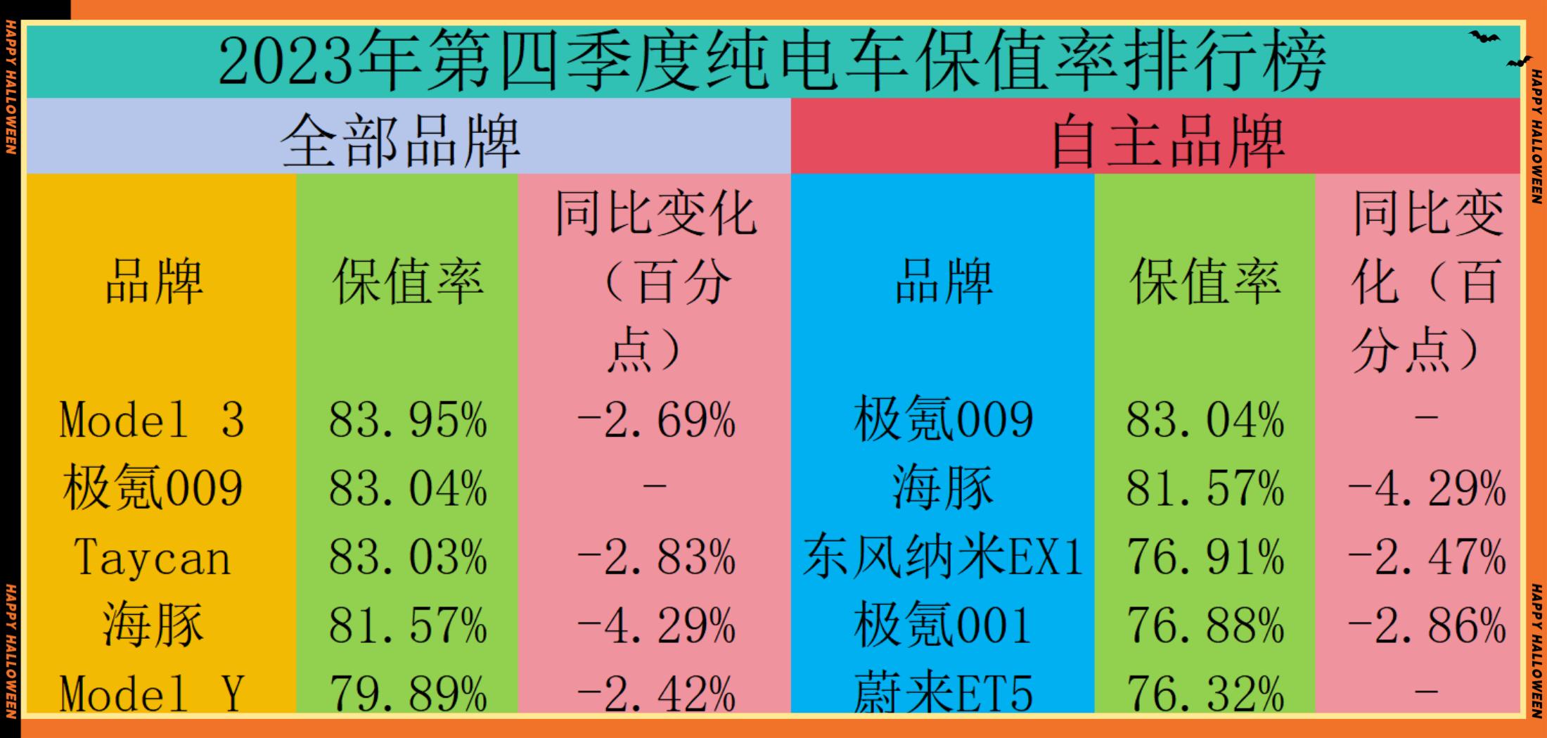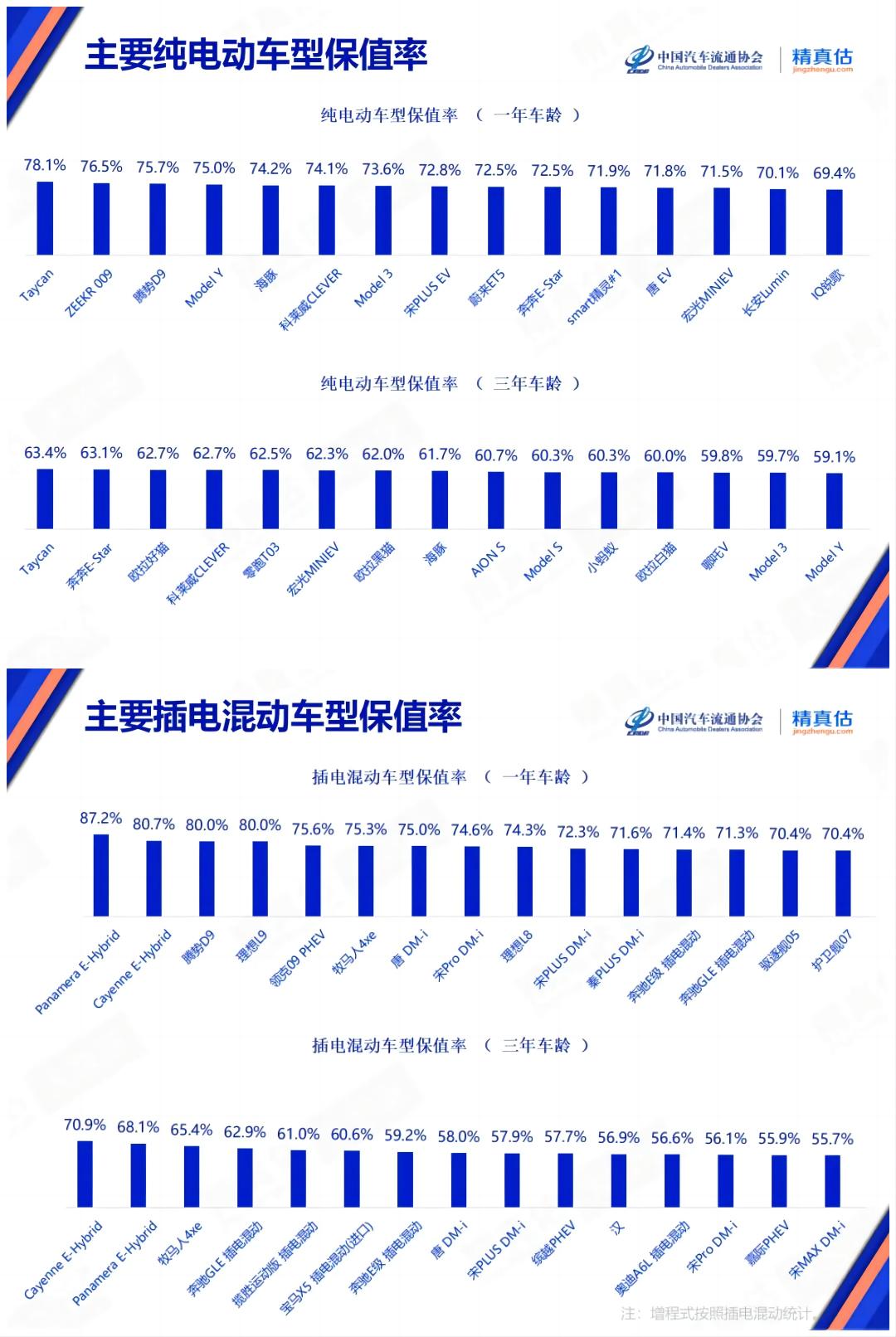 《2023年四季度中国汽车保值率排行榜》统计的数据,主要为新能源汽车一年保值率,分为纯电车和插混(包含增程式)两类,再根据SUV、轿车,以及价位细分。