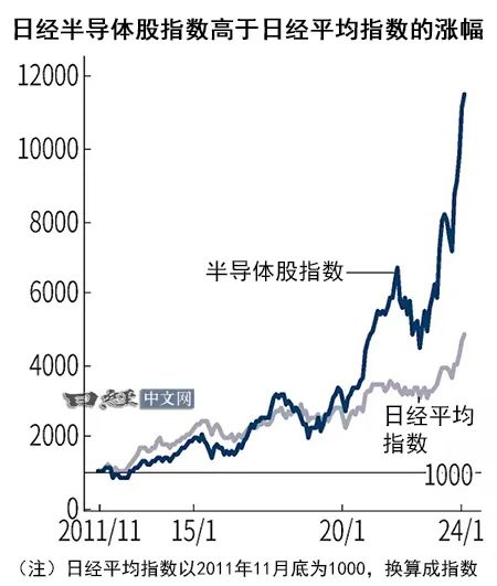 可通过以2011年11月底为基点(1000点)追溯并估算的数据确认过去的走势。结果显示,半导体股指数在12年零4个月里上升至11.5倍,远高于同期的日经指数(4.8倍)。
