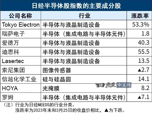 截至25日开始计算时,总市值最大的成分股是在半导体成膜、涂布和显影等广泛的制造工序设备方面拥有较高市场份额的Tokyo Electron(TEL)。此外,涉足MCU芯片等的瑞萨电子、制造设备和测试设备企业爱德万、迪思科、Lasertec也是权重较大的成分股。