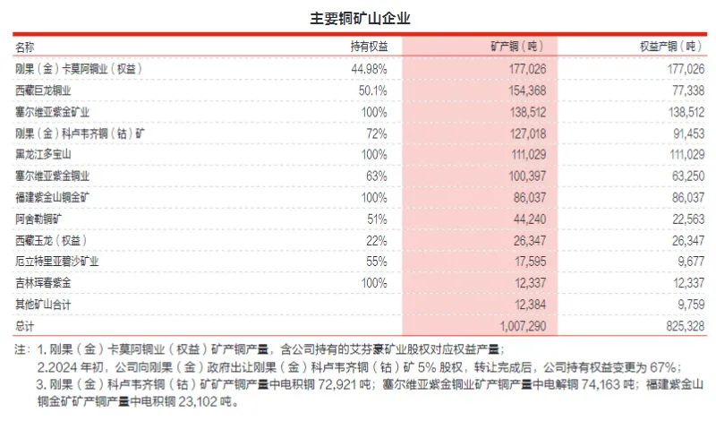 紫金矿业矿山产铜达100.73万吨,同比增长11.13%,并成为中国及亚洲唯一矿产铜产量破百万吨大关矿企,位居全球前五。根据中国有色金属工业协会数据,2023年中国实现矿山产铜161.9万吨,紫金矿业矿山产铜相当于中国总量的62%左右。