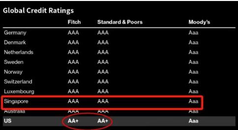 这使得近年来在全球经济下行的背景下,惠誉评级(Fitch Ratings)里的美国评级都只有AA+,而新加坡主权债务等级依然保持AAA等级,是亚洲唯一获得惠誉、标普穆迪和穆迪3大信用评级机构3A级信用评级的国家。