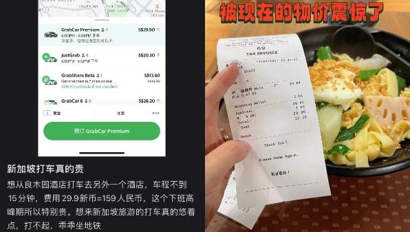 网友贴出的新加坡打车15分钟159元、一碗麻辣拌119元