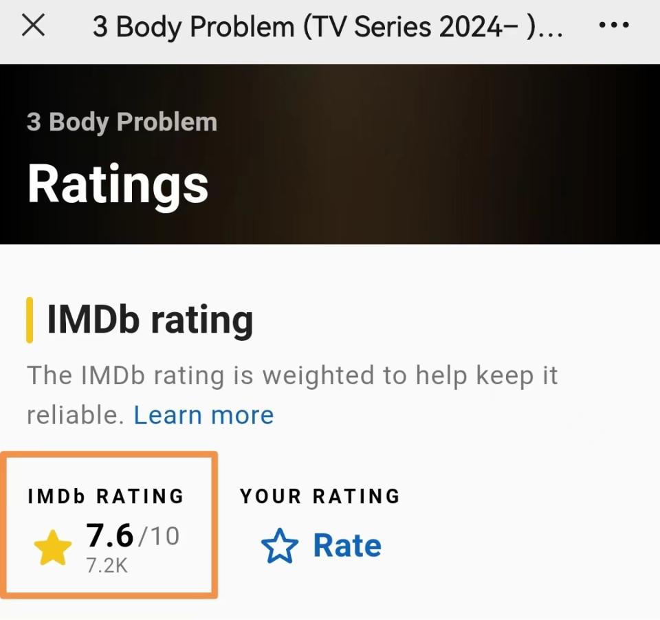 IMDB超过7000多名观众评出了7.6分,只有第5集单集评分出类拔萃达到8.7,其余的基本维持在7.0分至8.0分之间;豆瓣3万多名观众评出了6.7分,争议颇大,大多数给了三颗星和四颗星,现有数据表明甚至评分还有下降的空间;MetaCritic(MTC)媒体平台上,37家媒体对美剧《三体》进行系统评价和打分,综合评分指数70分。