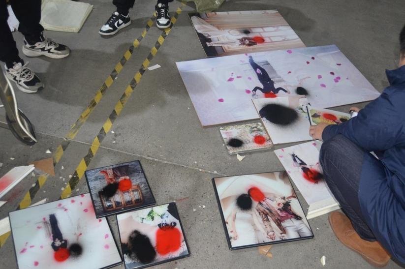 拆箱后的婚纱照等物品被铺散在厂房的地面上,属于同一位客户的被归置在一起。几个箱子拆下来,宽敞的厂房地面很快被铺满。接着刘玮会对照片进行喷漆操作——这是为了保护客户的隐私。