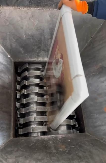 喷过漆之后的照片,会被丢进撕碎机。坚硬的钢铁齿轮交错滚动,随着两排齿轮连续咬合,相框慢慢被碾碎,一点点沉入机器内部。