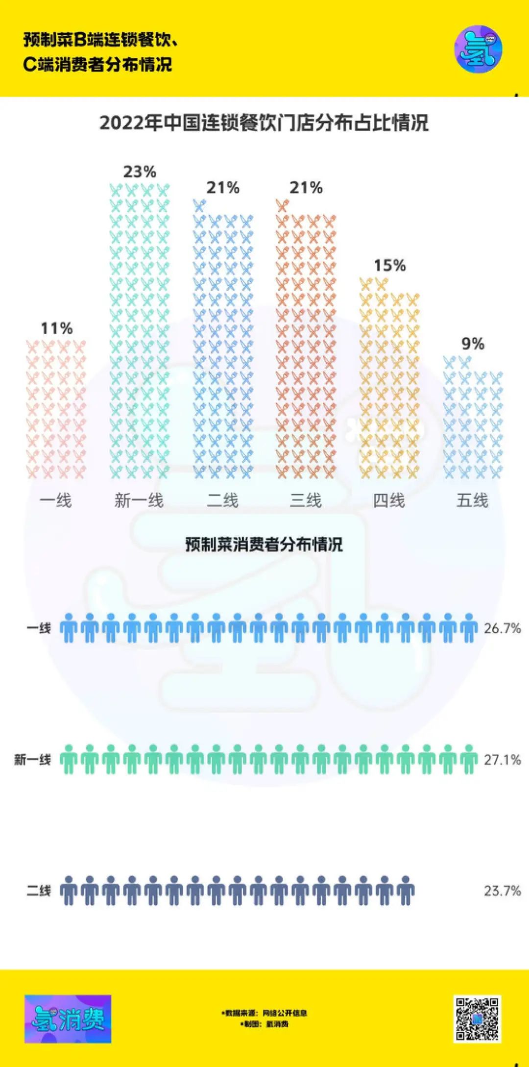 从消费端来看,消费预制菜的对象同时包含了B端和C端用户,在占比较高的B端市场,预制菜的重点目标一直都是连锁餐饮行业,2022年新一线城市当中连锁餐饮企业的门店分布最多,占比为23%,一线城市占比为11%,累计来看二线及以上城市的比重超过了55%。