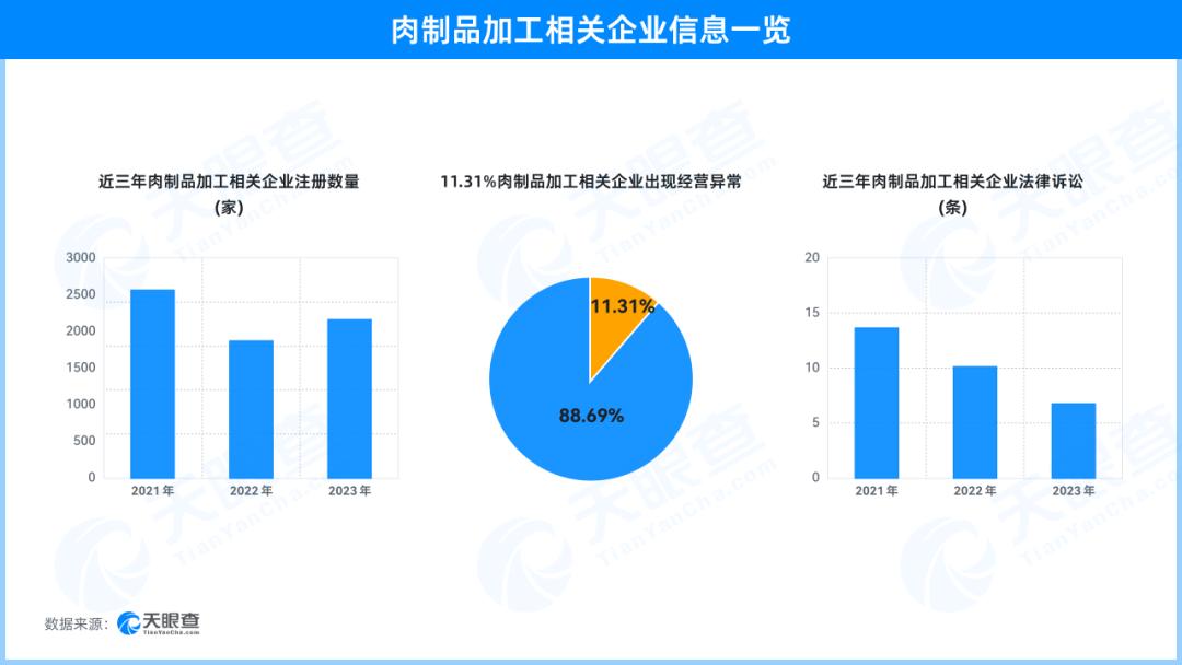 而根据天眼查天眼风险的显示,从事肉制品加工相关的业务企业中,3.52%的相关企业曾出现法律诉讼,11.31%的相关企业曾出现经营异常,2.39%的相关企业曾出现行政处罚。