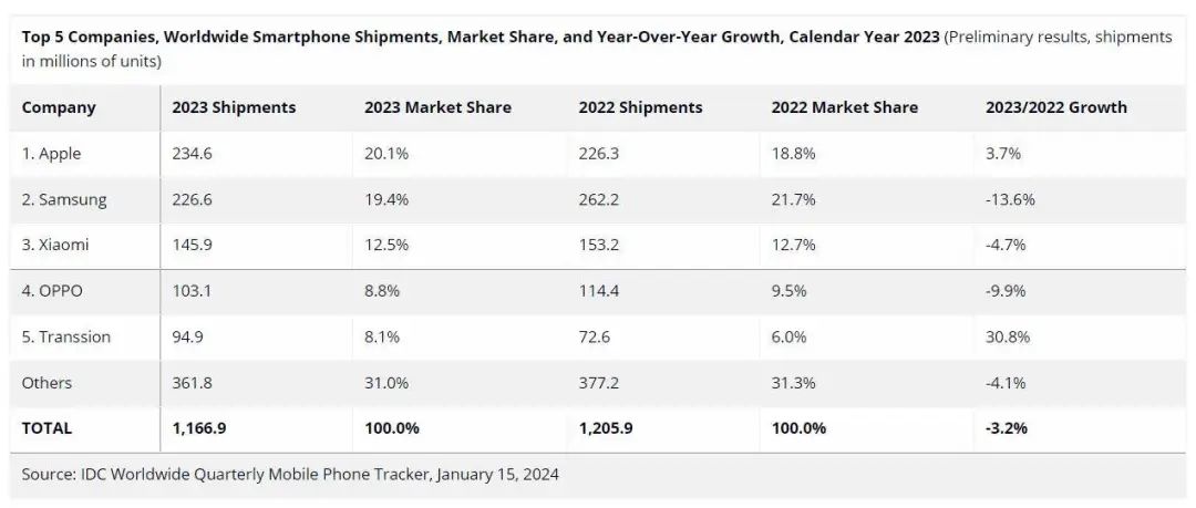 根据国际数据公司 IDC 的统计,三星在 2023 年全球智能手机市场占有率达到了 19.4%,苹果则成功登顶达到了 20.1%。
