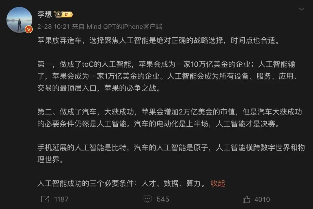 上个月的最后一天,苹果用 12 分钟的短会宣布:放弃造车,All in AI,汽车团队的众多成员将被调往 AI 部门。