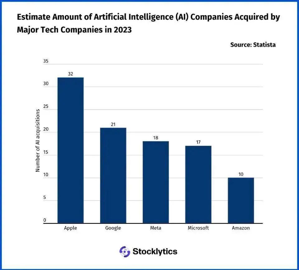 截止到 2023 年,苹果总共收购了 32 家 AI 公司,位列科技巨头中收购榜第一。