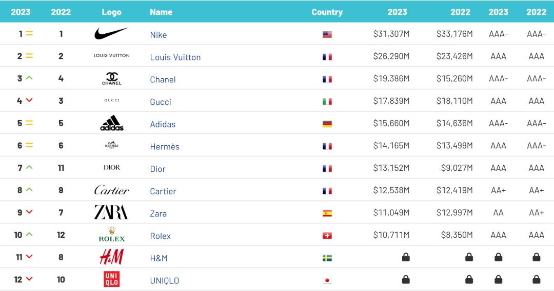 根据2023年Brandirectory推出的营收排行榜。前八中Nike排名第一,阿迪排名第五,其他都是高端奢侈品牌如LV/chanel/Gucci,而从第9名开始Zara,11名H&M,13名优衣库,则是家喻户晓的快时尚品牌。