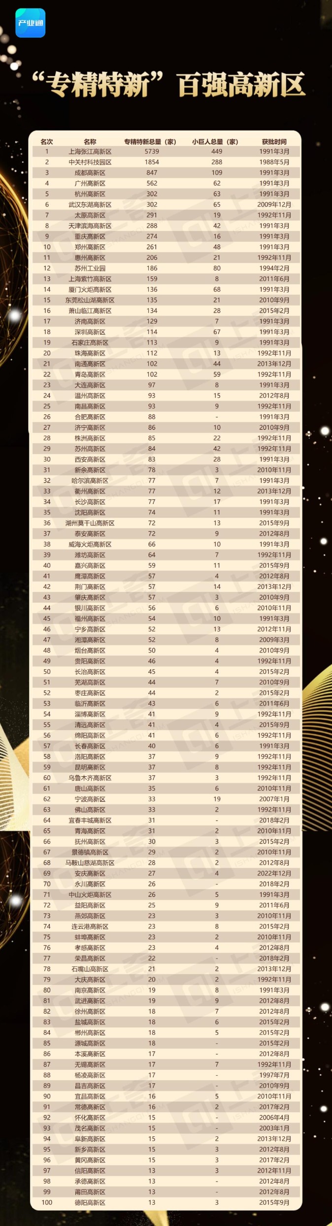 榜单以178个国家高新区为对象,统计所有注册地在高新区、且已被认定为国家级“小巨人”或省级专精特新的企业。统计时间截止到2023年12月31日,数据来源为上奇产业通。