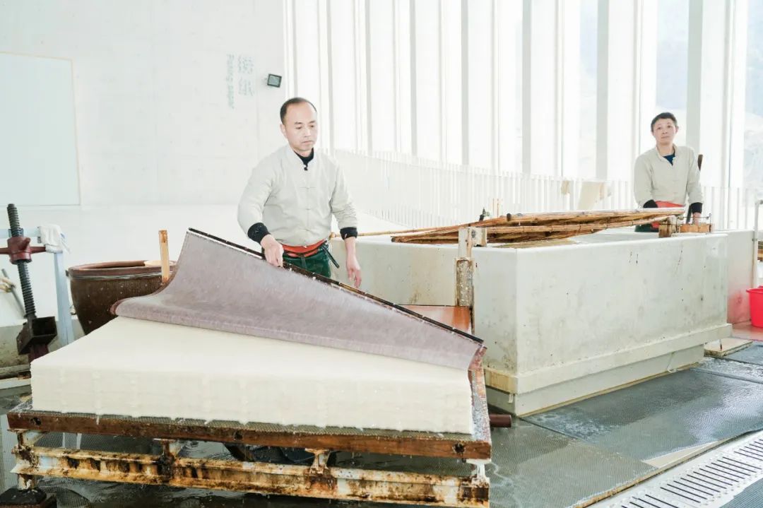 中国宣纸文化园,两位工作人员正在现场制作宣纸