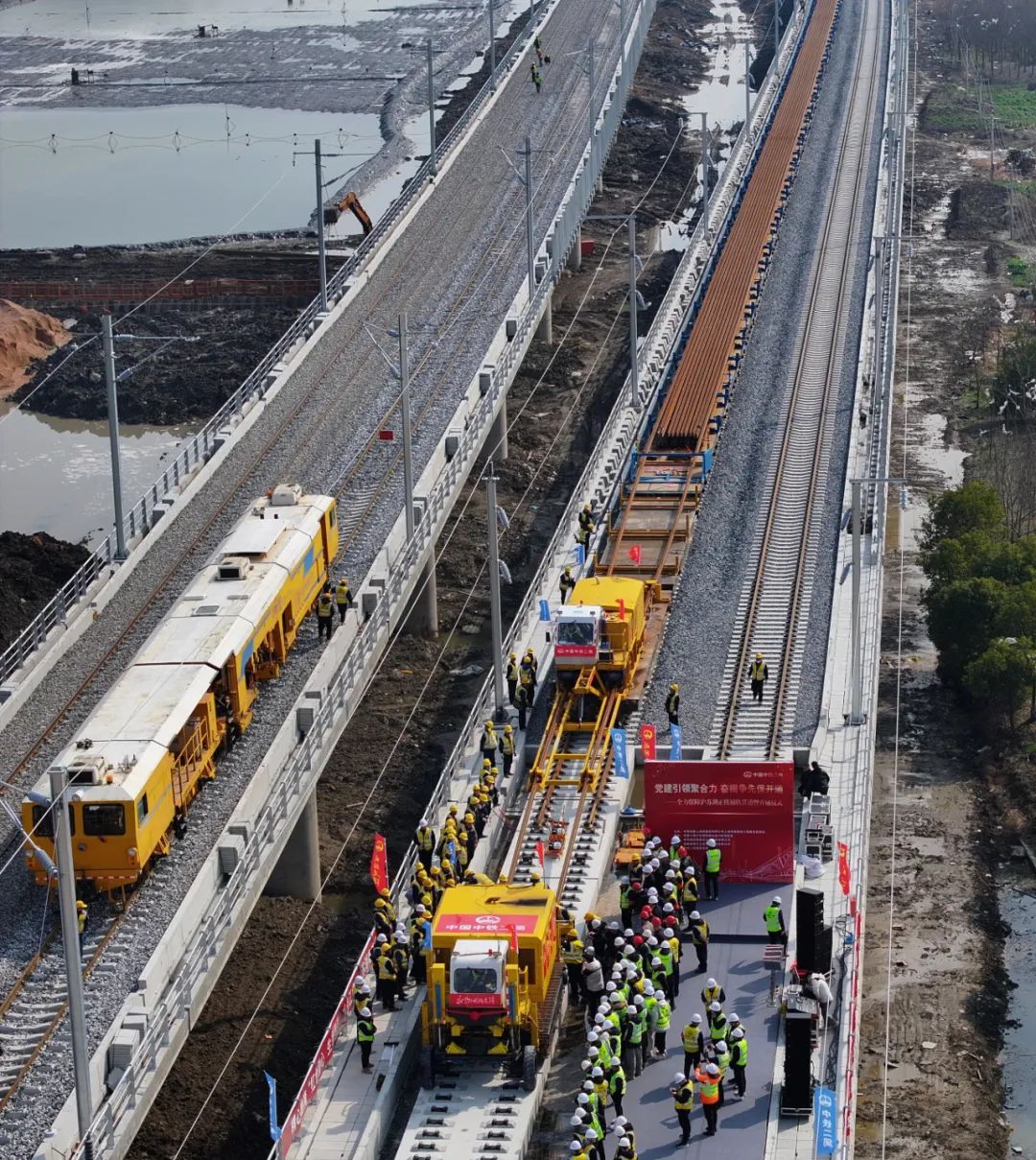 3月2日,在上海市松江区沪苏湖铁路施工现场,沪苏湖铁路开始全线铺轨 来源/上海铁道报