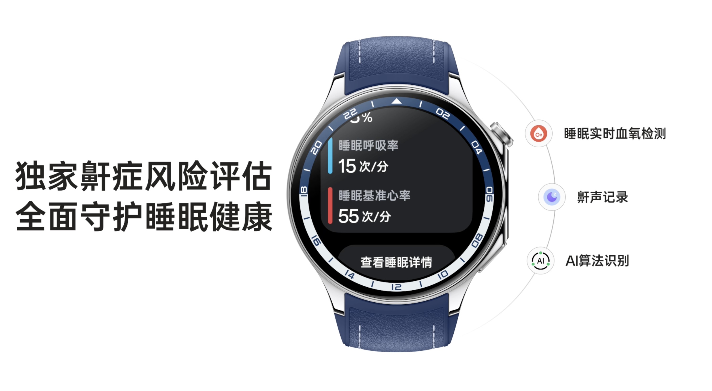 OPPO高度关注用户的睡眠健康,全新健康智眼2.0带来熬夜风险评估功能,通过多项心率和呼吸指标,为用户评估偶发和长期熬夜健康风险。同时,主动引导用户标记睡眠行为标签,循序渐进促进养成良好习惯。此外,OPPO手表的鼾症风险评估功能,在常规睡眠数据监测基础上,还能结合睡眠呼吸特征变化以及鼾声信息,通过AI算法识别鼾症风险等级,监测数据对比医学金标仪器准确率达到了93.9%。