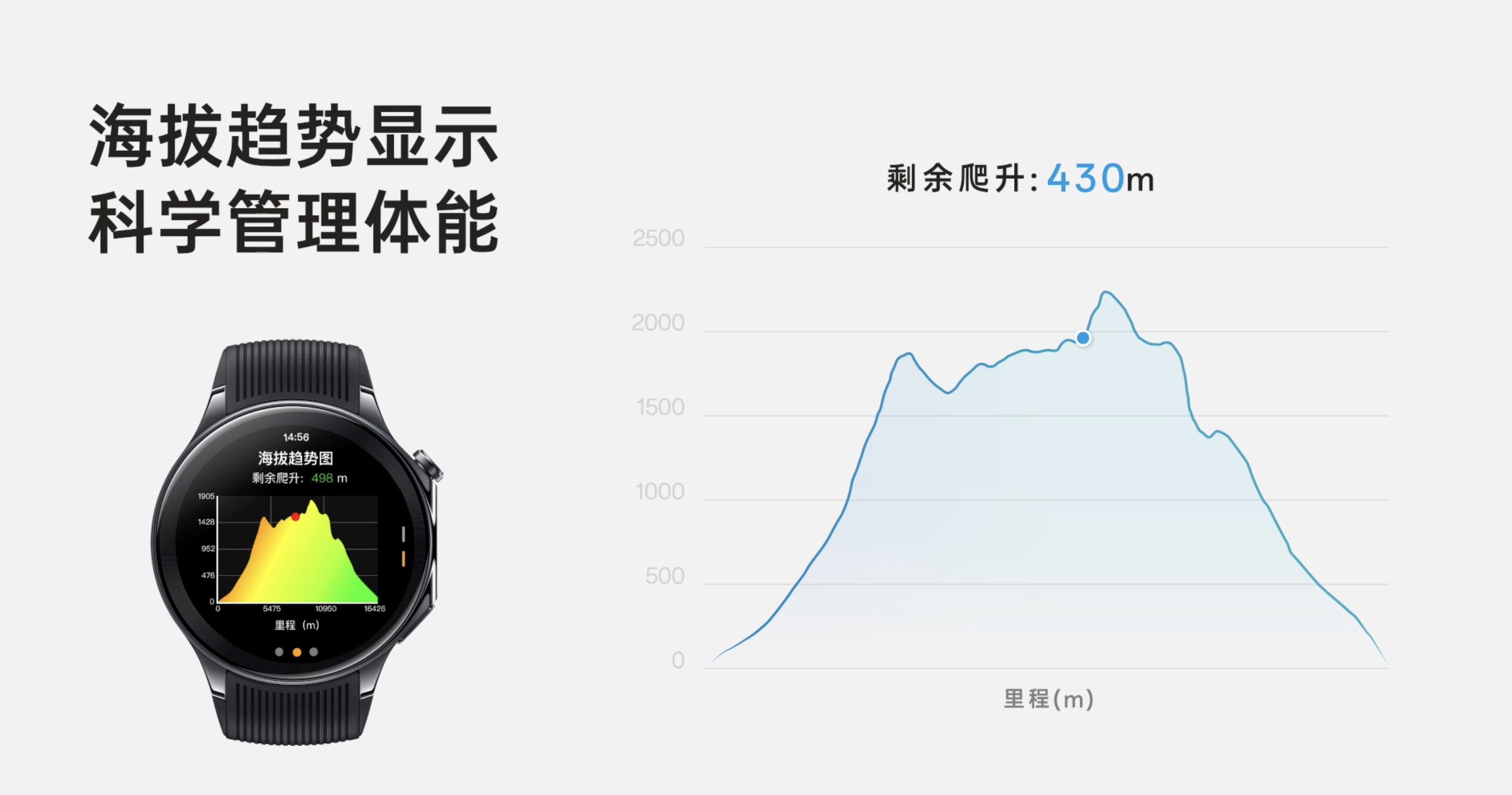 相比大部分手表采用的RTOS系统,OPPO 四年坚持做全智能手表,充分发挥安卓系统的智能化优势,更快更深度地与各个应用合作伙伴适配。OPPO Watch X 首次深度适配专业户外平台“两步路”,在手表上实现了轨迹导航、偏航提醒、轨迹叠加等常用功能。还支持超过3500万条户外徒步路线,可以从手机一键导入,实现了行业最便捷体验,并且支持海拔趋势显示,让爬升下降心中都有数。