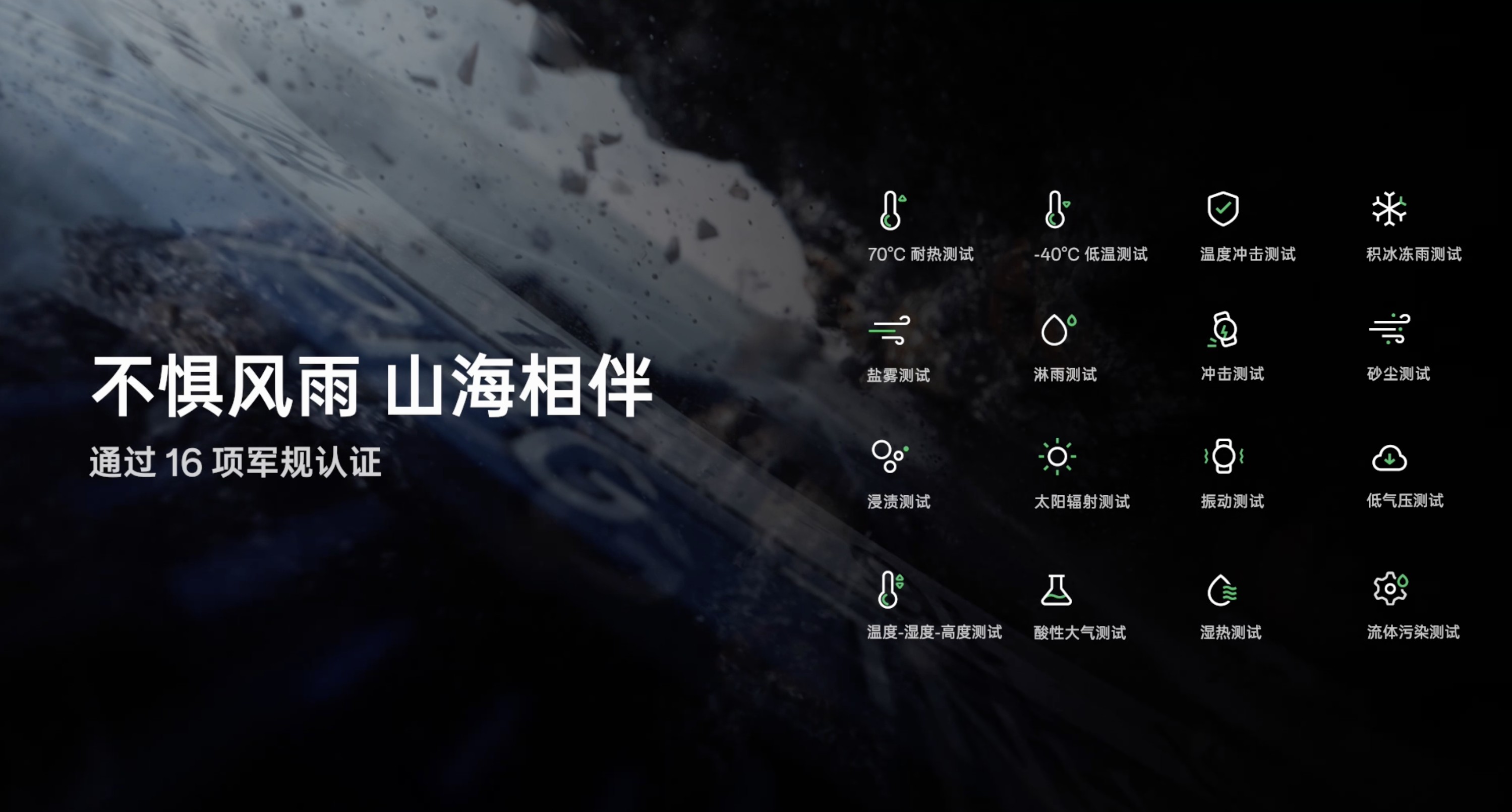 为打造能经受极端场景考验的可靠品质,OPPO Watch X 的表身采用一体锻压精钢材质,并对每一个按键、每一个开孔都进行特殊加强。这款手表还通过了16项严苛的军规测试,在户外高温、严寒、水浸、跌落冲击等恶劣环境下,都能够成为你可靠的伴侣。