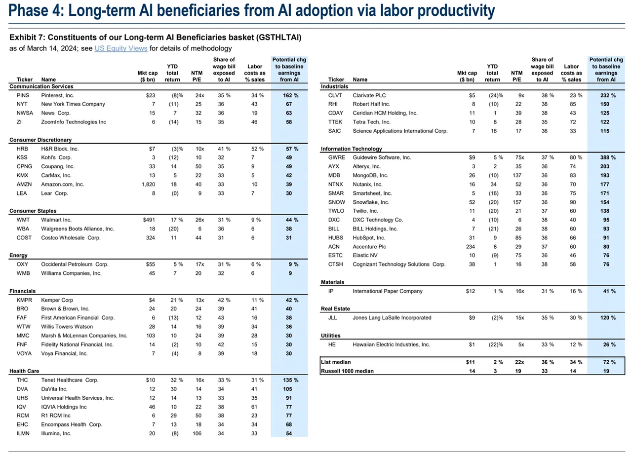 第四阶段的“生产力提升”,则主要聚焦于利用 AI 技术来提高生产效率的公司,特别是软件服务和商业服务等劳动密集型行业,该行业容易受到 AI 自动化的影响。